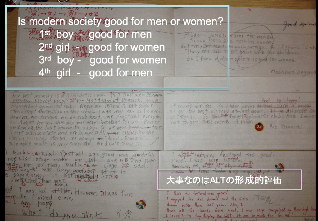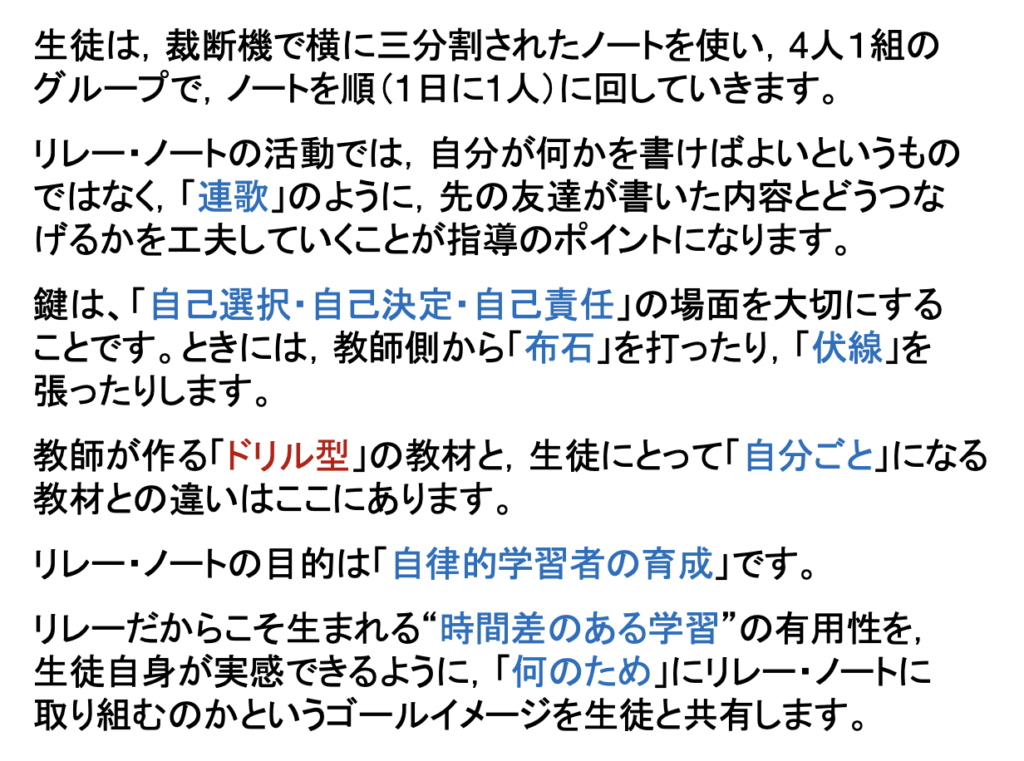 ノートは、自分の思考の軌跡(履歴)を残し、自分や仲間と対話をする場なので、できるだけ書いたものを消さずに残しておく指導をした方が「思考」を深めることができます。(パソコンのデータも「上書き」はNGです。前のバージョンの方が良かったというケースがたくさんあるからです)