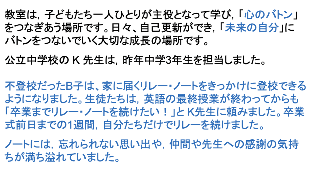 タブレット端末は「情報を扱う力」を育て、ノートは「考える力」を育てます。どちらが良い・悪いではなく、どちらを“どう使うか”が学びを変える鍵となります。「つけたい力は何なのか」を教師が明確にした上で言語活動を仕組むということです。