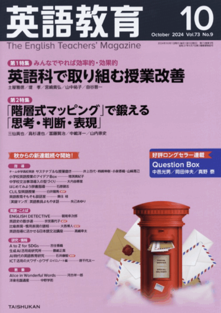 この実践は、大修館書店『英語教育』2023年10月号の特集でご紹介しました。その記事は多くの読者にインパクトを与え、未だにバックナンバーが出ているそうです。町田市では、英語科の先生方の希望で何度も「実際に体験をする研修会」を行いました。その取り組みはいま、他地域にも広がりつつあります。(* 10月号は大修館書店HPの「バックナンバー」から入手可能です)