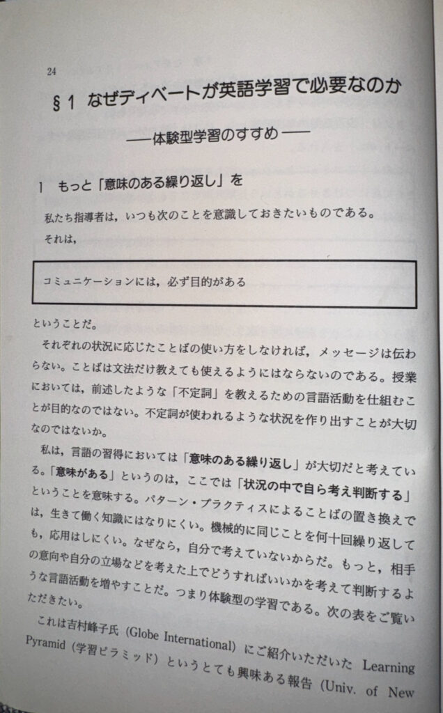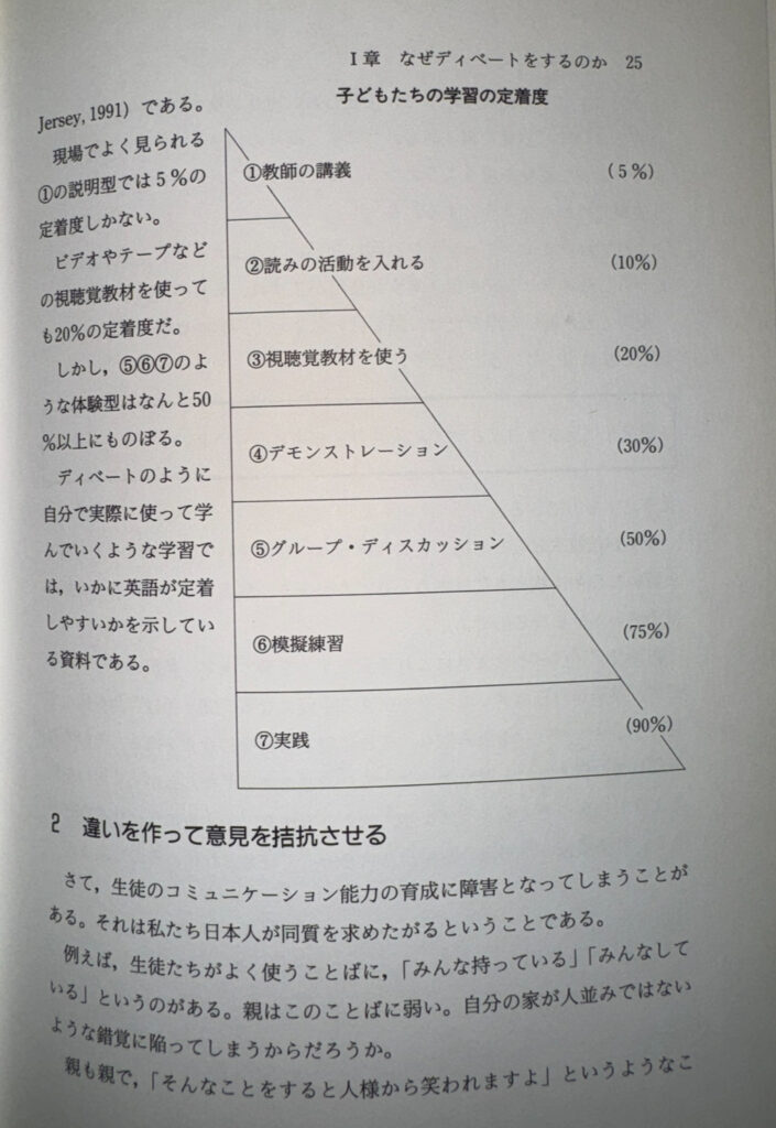拙著『英語ディベート授業30の技』(明治図書1997)では、当時まだ日本ではあまり知られていなかった The Learning Pyramid をご紹介しました。その後、多くの書籍で引用されるようになり、今では「アクティブ・ラーニング」の根拠として広く語られるようになりました。どの著者も、その信頼性を実感されたのだと考えます。