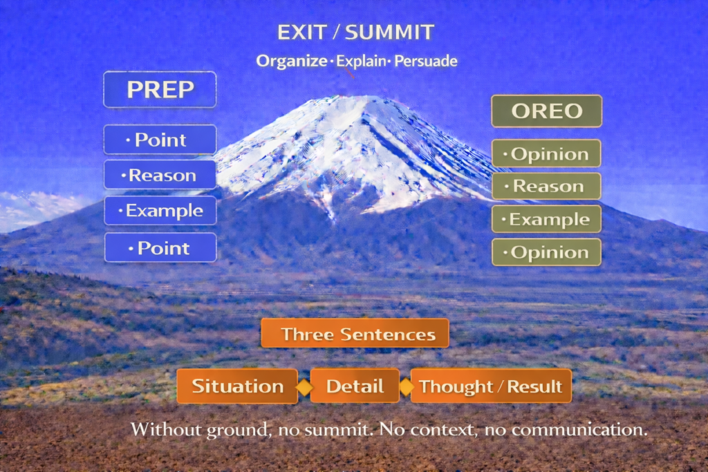第4回:Three Sentences. が、PREP と OREO を“使える指導”に変える OREO and PREP organize ideas.“Three Sentences.” creates the reason to speak. (OREO や PREP は「考えを論理を整える設計」。Three Sentences. は「話し始める理由をつくる設計」)... -